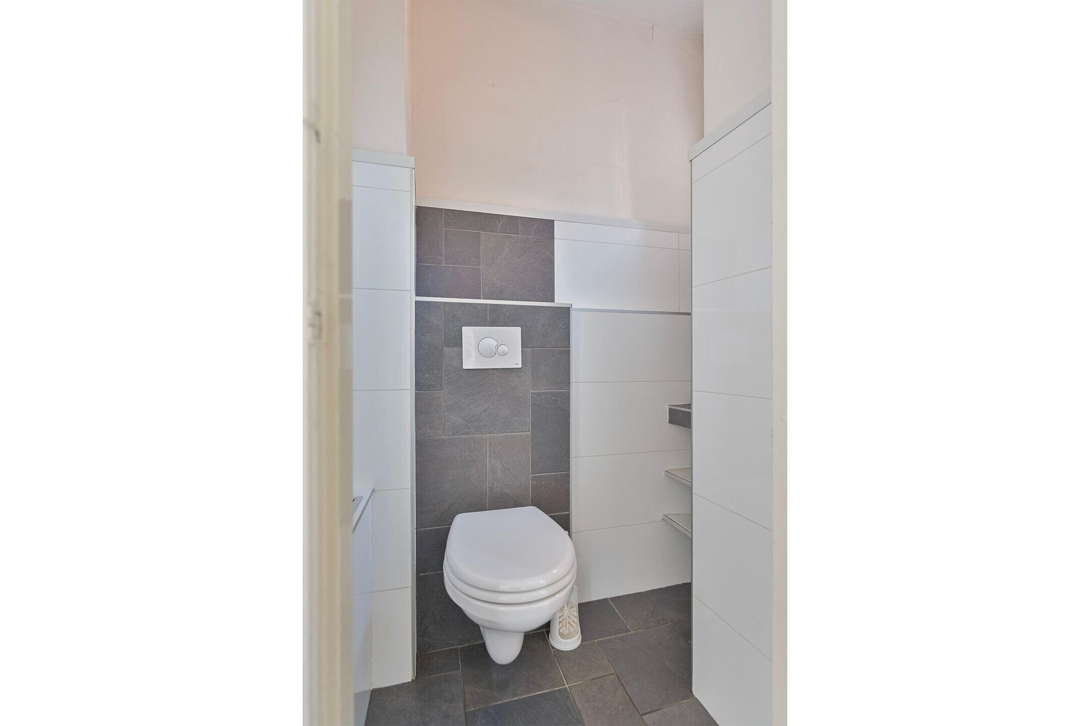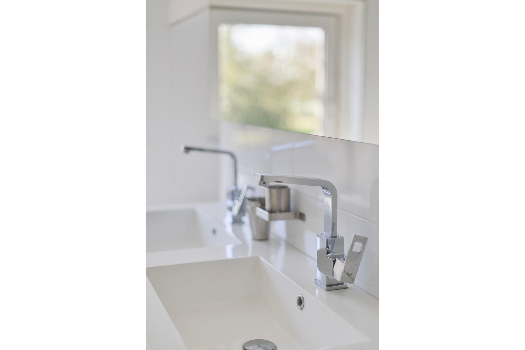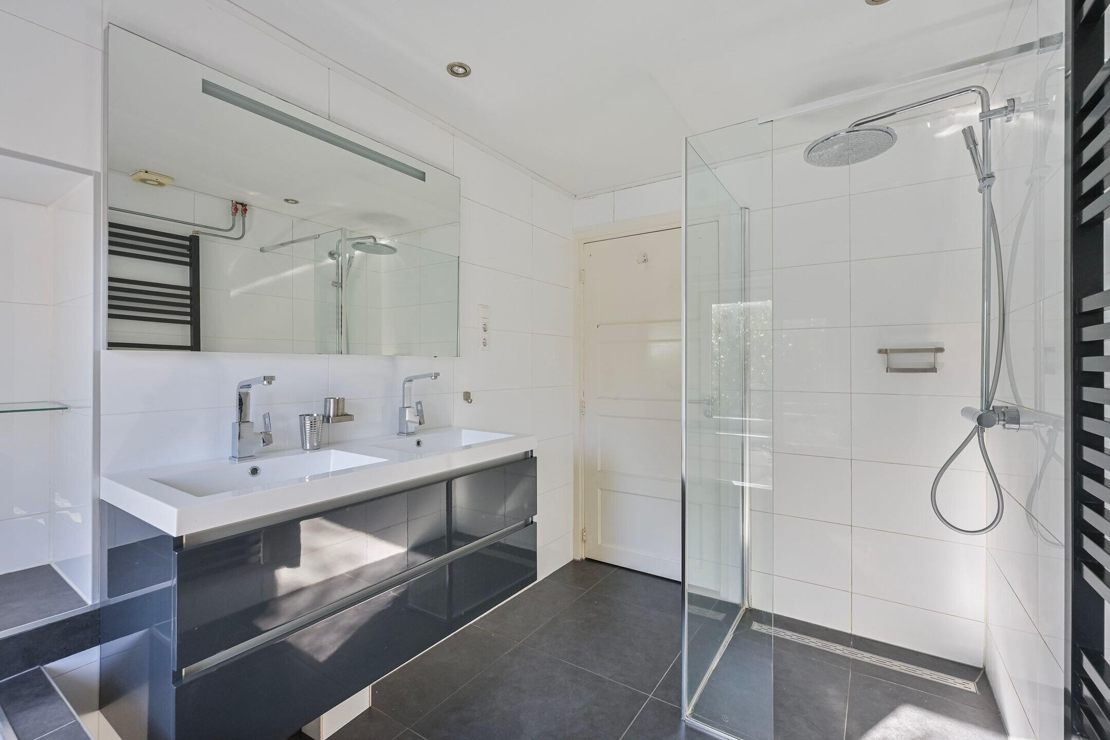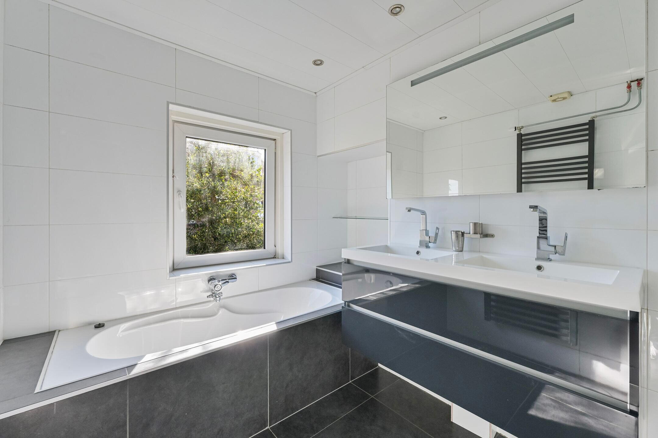 De eerste verdieping telt twee royale slaapkamers en een moderne badkamer. De hoofdslaapkamer beschikt over een praktische kastenwand en toegang tot het balkon aan de achterzijde. De complete badkamer is uitgerust met een inloopdouche, ligbad, tweepersoons wastafelmeubel en handdoekradiator. Daarnaast zijn er een separaat toilet gecombineerd met een praktische wasruimte.